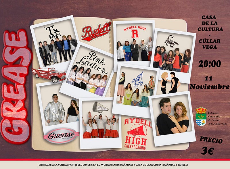 Las entradas para el musical Grease de este sábado pueden adquirirse en la taquilla de la Casa de la Cultura durante esta semana, en horario de 17 a 21 horas, a un precio de tres euros. Además, en caso de que queden disponibles, podrán comprarse el mismo sábado una hora antes del comienzo del musical.