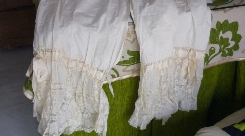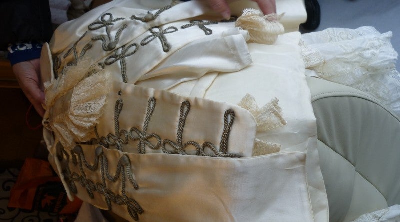 A continuación pasamos al comedor, aquí Encarnita abre un armario y me va enseñando toda clase de ropa, que ella misma ha confeccionado, para sus mil y una muñecas. Me enseña trajecillos de niño, pololos (bragas antiguas) de mujer, sayas, una chaquetilla como la que llevaron los infantes en la boda del rey Felipe VI, vestidos con encajes y muchos gorros para sus quecas. También me muestra cajas y maletines, con encajes y pañuelos, varios paraguas del siglo XIX, de los que llevaban las señoritas (nobles) de la clase alta, un maletín de la escuela, con dibujos dorados, de los años cincuenta y un sinfín de objetos. Junto al balcón, dos muñecas grandes están sentadas en una mecedora y en un sillón y, encima de una estantería, tiene varios maniquís pequeños, adornados con chaquetillas y vestidos de mujer.