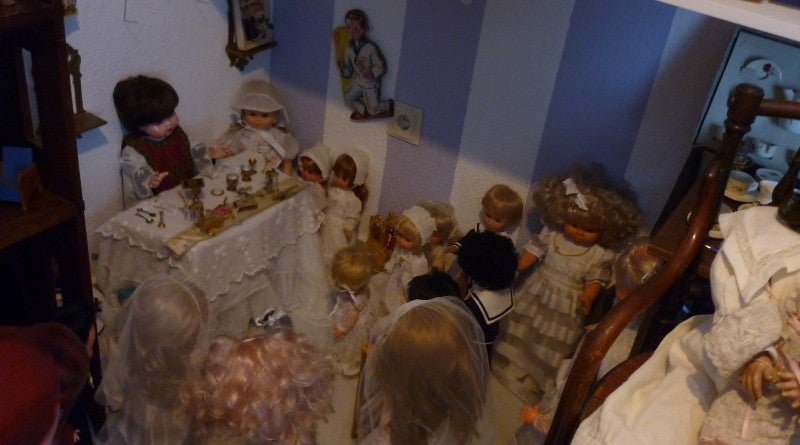 Volviendo al principio, Encarnita me llevó a su Casa de las Muñecas y, cuando entré, tuve la impresión de estar en el País de las Maravillas. Nunca había visto cosa igual: el comedor y una habitación llenos completamente de muñecas, utensilios, casitas, encajes, vestidos y toda clase de muebles infantiles… En la habitación no cogía un alfiler y eché una foto desde la puerta: a la izquierda hay tres estanterías llenas de muñecas pequeñas y grandes, con maletines y estuches, y al lado de la ventana hay dos mapamundis, de los años sesenta, que pertenecieron al Colegio de la Presentación de Guadix. Algunas de las muñecas son Mariquitas Pérez, que salieron en los años cuarenta. Junto a la pared del fondo hay dos pupitres antiguos, de diferente tamaño, con lapiceros, tinteros y plumines, donde varias muñecas con gorros están sentadas. En el rincón hay un bebé en el tacataca y al lado una muñeca con un cochecito de bebé. Algunas muñecas son alemanas, del siglo XVIII, y otras son francesas, lo que da idea de su valor, junto a estuches de tazas de café. La mayoría de los juguetes y utensilios, Encarnita los ha comprado en las tiendas de antigüedades. Al lado de la puerta hay varias estanterías y, de la pared, cuelgan varios maletines de la escuela, de los años sesenta. En el suelo destacan dos caballos de cartón, de los que usaban en los estudios fotográficos para retratar a los niños. En otro estante destaca la cocina, con su horno y un panel con sartenes y cacharros. Al lado hay también dos pequeñas cocinas, con varios fuegos, de las primeras de butano. En un rincón un muñeco oficia la misa, en el altar, “son hostias de verdad, que recorté” –me dice Encarnita–, y alrededor hay niños y niñas, vestidos de primera comunión.