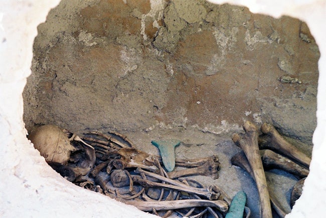 Lo primero que llama la atención es la ubicación del poblado, en lo más alto de una colina escarpada, como tantos y tantos castillos posteriores que buscaban el lugar más fácilmente defendible. En esa cima, aprovechando distintas terrazas del terreno, construyeron sus cabañas e, incluso, dispusieron unas estrechas calles protegidas por un muro en su lado exterior. Pero no solo eso: en la zona más elevada fueron capaces de hacer una cisterna para almacenar el agua de lluvia. Y junto a las viviendas o dentro de ellas estaban los espacios funerarios, covachas donde sus habitantes eran enterrados individualmente en la mayoría de los casos, con un ajuar compuesto por unos pocos instrumentos y armas, vasijas de barro donde se habrían depositado alimentos y abalorios de cobre o plata. No obstante, hay también sepulturas dobles y otras de más individuos, adultos de ambos sexos y niños, lo que lleva a pensar que fueran enterramientos familiares.