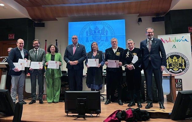 A continuación, en el mismo lugar, se celebró la solemne apertura de los eventos conmemorativos de esta efeméride. Fue un gran acto institucional donde se dieron presencia la Sra. Rectora Magnífica de la Universidad de Granada, Pilar Aranda Ramírez, que fue nuestra anfitriona en dicho evento, más los altos cargos políticos de la Junta de Andalucía como el Sr. Consejero de Turismo, Cultura y Deporte, Arturo Bernal Bergua; la Sra. Secretaria de Turismo, Yolanda de Aguilar Rosell; la Sra. Directora General de Turismo, María Rueda Fernández; el Sr. Delegado Territorial del Gobierno de la Junta de Andalucía, Antonio Granados y su homónimo cordobés, Adolfo Molina que es miembro de la tuna del Distrito; y la concejala del PP en el Ayuntamiento de Granada, Eva Martín. De igual forma, estuvieron presentes en dicha mesa de autoridades el Sr. Director del Colegio Mayor Santa Cruz la Real, Juan García Montero. Todo este acto institucional estuvo conducido por José Luis López Fuentes, Presidente de la Audiencia Provincial de Granada y, a su vez, miembro de la tuna del Distrito.