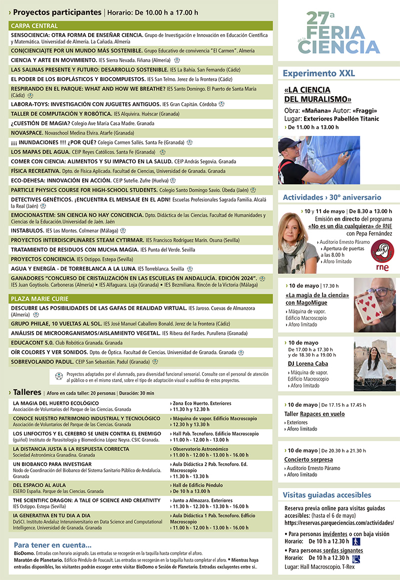 Casi 500 participantes, con representación de todas las provincias andaluzas, presentarán sus proyectos —un total de 30— sobre medioambiente y biodiversidad, ciencia recreativa, robótica, astronomía e incluso sobre técnicas de detección de noticias falsas y bulos, en la 27ª Feria de la Ciencia que se ubicará en los exteriores del Parque (Carpa y Plaza Curie). Además se han programado una serie de talleres demostrativos para los participantes y visitantes de la Feria, dirigidos a todas las edades, que estarán repartidos por distintas ubicaciones y que serán impartidos por instituciones colaboradoras.
