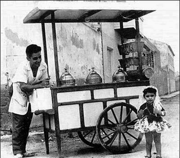 Rápidos, veloces íbamos a la puerta de “la Posá” (que es como se llamaba a una antigua Posada que allí existía) y “El Chapeo”, ceremonioso, destapando el depósito de corcho donde tenía el rico helado, nos servía dos grandes galletas con el helado emparedado, así hecho con un artilugio que, con maña, el vendedor rellenaba tras haber colocado una galleta en el fondo y otra en la parte superior; empuja una palanca y salía un riquísimo “helado al corte”, le decían; y dos reales costaba cada uno. Aunque también estaban los de un sólo real que, con una única paletada, sobre un cucurucho el heladero maniobraba para hacer que, con poca materia, pareciera mucho.
