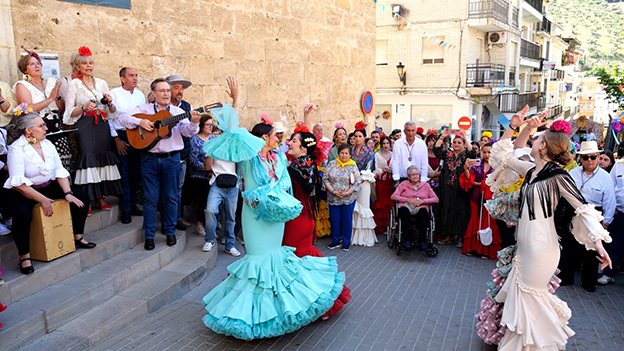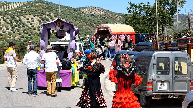 Una fiesta en la que se une la devoción con lo pagano, los bailes, los brindis, los bautizos en la fuente de los milagros, el compartir los alimentos durante el camino y cómo no, a la llegada al paradisíaco entorno del Cortijo las Llanadas, donde tenemos la alameda donde todos nos sentamos como si se tratara de una gran familia formada este año por unos 2000 participantes.