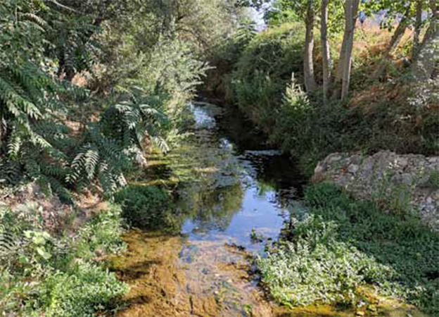 A punto estuve de perder el equilibrio y caer al agua del río, pasando las resbaladizas “pasaeras” de piedras dispuestas en hilera por las que se podía cruzar a la otra ribera. Y toda la culpa fue del pequeño repullo que me hizo dar una rana, que dando un gran salto, a punto estuvo de chocar conmigo, antes de dar su barrigazo y accidentado aterrizaje, en el pequeño remanso que hacían, con el agua, las pasaderas. Emprendí la subida del último tramo de vereda, que ahora se convirtió en estrecho carril que entre tapiales de piedra lo separaban de las fincas colindantes. A la derecha, una huerta del Sr. Moleón, el de La Tienda Nueva; a la izquierda otro trozo de tierra con un gran y viejo peral en el centro, propiedad de los apodados “Chaparricos”, muy buena gente, en la parte baja de la finca, antes de llegar al río, una alameda de chopos comenzaba junto al cauce y se prolongaba y seguía aguas arriba.