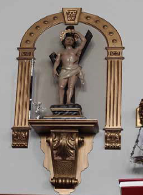 En la nave izquierda y en la cabecera de ésta, nuestro querido Patrón San Sebastián, centurión de los ejércitos romanos, que fue asaetado por no querer renegar de la fe cristiana a la que había abrazado con toda su alma. Al comienzo de esta misma nave, un Cristo Crucificado de bella y artística estampa, que de ser tallado en madera a escayola que es, sería una gran obra artística de incalculable valor por su cautivador semblante y su esbelta y bella imagen. Ese Cristo majestuoso y cautivador de nobles sentimientos, al que yo siempre miré y respeté con cristiana admiración, ahora, preside la nueva iglesia, sobre su altar mayor colocado, ocupando un lugar de honor, en tan sacro lugar. Cuando ahora, pasados los años, entro al templo, mi mirada primera es clavada en la imagen de ese Cristo Crucificado, que siempre fue testigo de mi existencia, siempre por mi admirado y confidente divino de mis oraciones, plegarias y ruegos.