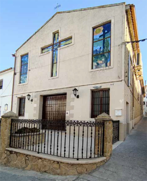 En el medio del frontal del Altar Mayor, entonces había una hornacina que albergaba una escena de la Encarnación, compuesta por una estatua de un Ángel Anunciador y la bonita Virgen María arrodillada en humilde y santo gesto de oración. Tras éstas, la pared de la hornacina estaba enriquecida -o al menos esa era su pretensión- de un fresco anónimo, pintado, y ya muy deteriorado, con motivos de plantas, alguna flor y estrellas que lo componían y una paloma blanca sobre un haz de luz, que en la parte superior, lo que se adivinaba el cielo, y que representaba la tercera Persona de la Santísima Trinidad: el Espíritu Santo, Testigo, Hacedor y Motivo del tal Misterio de la Anunciación. Al fondo, la torre de la Iglesia mientras la construían. Benalúa de las Villas Hijos Dulces de Dios – 102 – La verdad, que mi recuerdo de este fresco, está difuminado y perdido en la mente de mis años y de los tiempos.