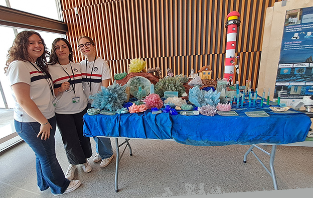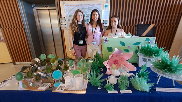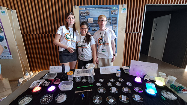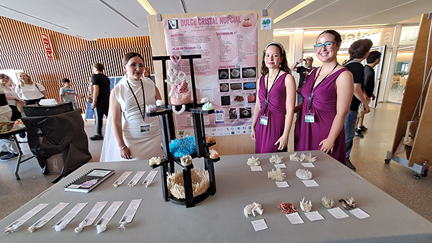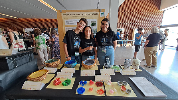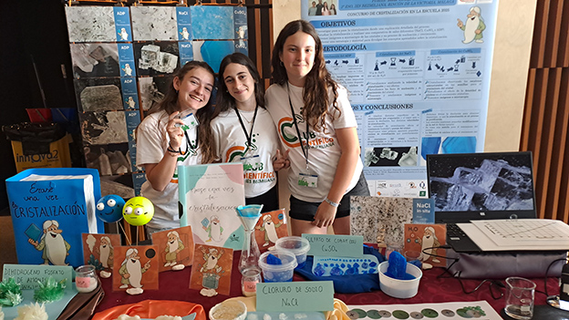 En otro de los expositores, situados en el pasillo central conocimos a Hanca, Inés y Eiden, alumnas del Instituto IES Mediterráneo de Málaga que aprovecharon la oportunidad para explicar su investigación titulada ‘Dando un giro a la cristalización’. Junto a ellas, ataviadas de madrinas y novia estaban Rode, Claudia y Zuli, de Instituto Huarte de San Juan de Linares (Jaén) que explicaron con brillantez su trabajo basado en el ADP y en las distintas formas en que cristaliza dependiendo de las condiciones. También lo hicieron María José, Javier y Mercedes, estudiantes de 3º de la ESO, del IES Blas Infante en Ojígares que nos expusieron su trabajo llamado ‘Luces y sombra de los cristales’. Seguidamente lo harían Adriana, Mar y Alicia de cuarto de la ESO del colegio Ciudad de Almería sobre trabajo de cristalización titulado ‘Un cabo cristalino’ para lo que comenzaron explicando lo que se entiende por cristalización, «un proceso de solidificación de un líquido de gas o de una disolución de iones átomos y moléculas que se unen creando redes cristalinas».