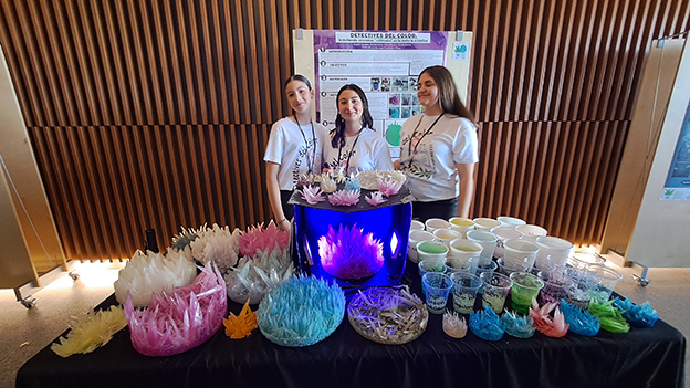 Ciertamente entendemos la anunciada dificultad pues tuvimos la oportunidad de recorrer todos los stands y escuchar de algunos de sus protagonistas las investigaciones que han llegado a cabo. En concreto, Rosa, Isabela y Paula, alumnas de cuarto y segundo de la ESO del Colegio Diocesano de San Ildefonso explicaban el contenido de sus dos puestos que permitían conocer con gran lujo de detalles lo que es cristalización sensible y la cristalización con sal de ADP. También se entregaban a fondo las alumnas de segundo de la ESO del Instituto José Saramago de Humilladero (Málaga) cuyo trabajo titulaba ‘Detective del color. Investigando colorante infiltrado en la materia cristalina’.