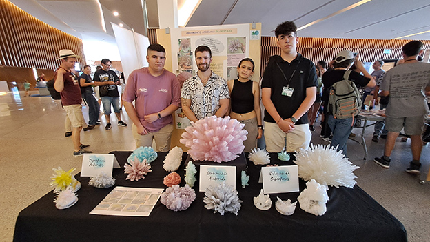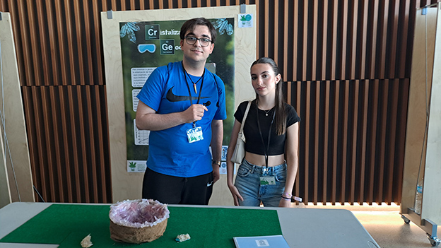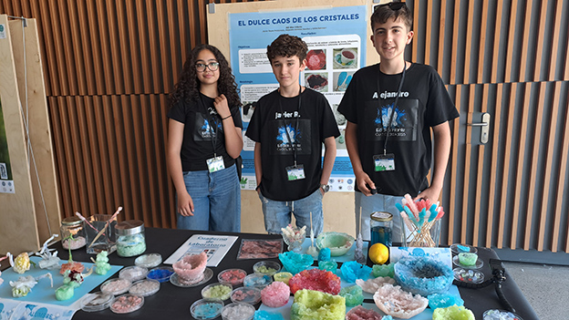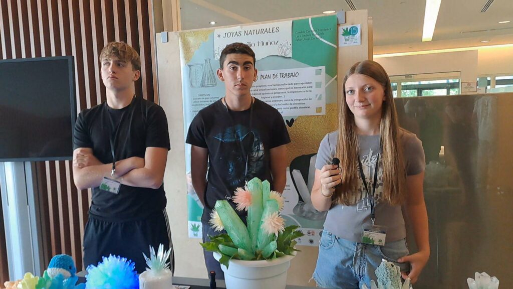 También se mostraban muy satisfechos Paula, Enelí y Alejandro, alumnos del Instituto Bezmiliana de Primero Bachillerato a la hora de presentar su proyecto ‘Cristales perfectos el mundo cúbico de la lumbre’ que explicaron con todo lujo de detalles. Por su parte, Carlos y María Ángeles del Instituto de La Carolina (Jaén) explicaron el proceso de creación de su geoda que han realizado durante varias semanas en clase de Física y Química. Sus vecinos de expositor fueron Alejandro, Javier y Rita del IES Blas Infante que nos daban a conocer cómo habían trabajado con unos cristales de azúcar a los que habían añadido distintos sabores alimenticio, habían realizado geodas con productos naturales y los efectos del alumbre con ADP y con bórax.