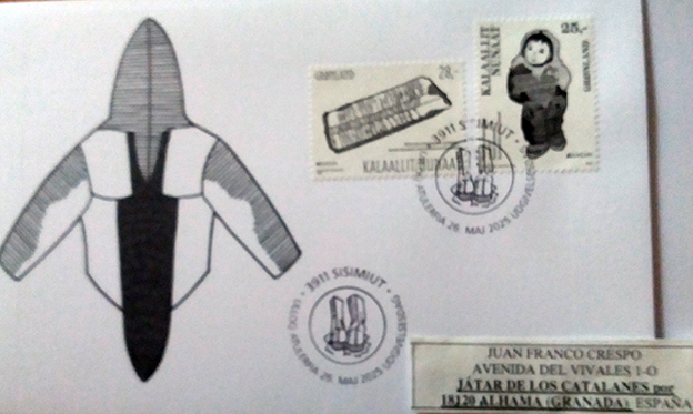 Groenlandia nos trae dos sellos -25 y 28 coronas, tarifa interior y europea respectivamente- que vendrían a totalizar unos siete euros, sin quererlo, nos enfrente al galopante y silencioso encarecimiento ¿o era inflación?, de nuestra cotidiana realidad. ¡Qué lejos quedan aquellas tarifas del pasado pero desde la llegada del Euro se esfumaron! No nos quejemos los “mandamases” las colocan para velar por nuestros intereses. O como decíamos en Alhama de críos: la vin cuánta necedad nos ha caído encima.