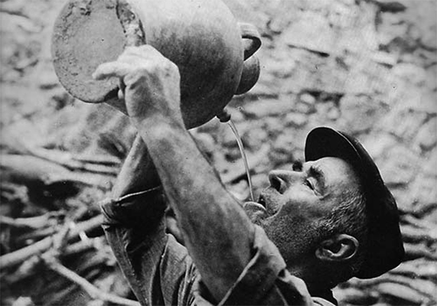 El aguador, raudo y ligero, cumplía su misión y, de vuelta al tajo, de uno en uno les ofrecía la vasija del agua, donde cada cual bebía. Se solía tener sed, por el duro trabajo, pero aunque así no fuera, se bebía. Esos instantes servían de descanso, de respiro y, tras satisfacer e hidratar el cuerpo, mascullando algún palabro… ”¡Ay Dios mío… Trabajar para vivir!” Solía decir uno de aquellos rudos hombres que formaban la cuadrilla, de vez en cuando. No era una queja, no era una crítica, era una frase que, en su costumbre y mente escrita, decía como amuleto después de terminar de beber. Empuñando su amocafre con renovado brío, volvía a golpear el agro con agilidad, sabios golpes y escaldos, dados en los claros de las matas de trigo verde.