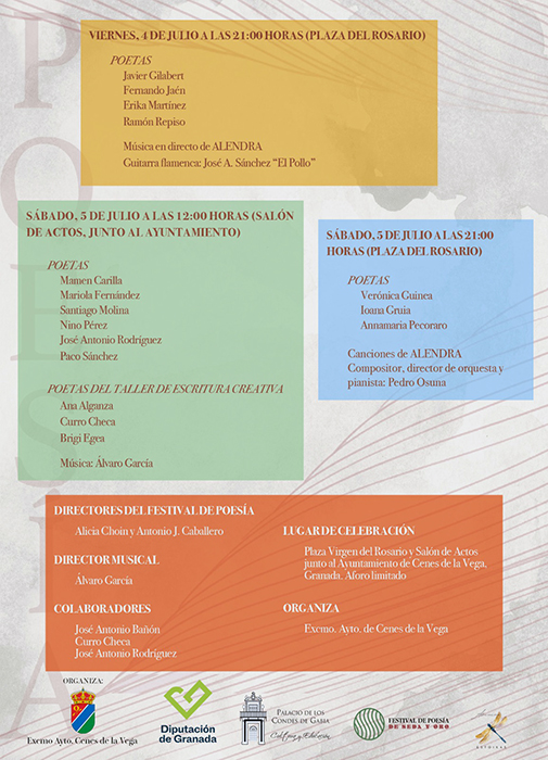 El festival cuenta con el apoyo del Ayuntamiento de Cenes de la Vega y se desarrolla en distintos espacios del municipio, invitando a todos los públicos a participar en un encuentro donde la poesía tiene cuerpo y vocación de encuentro.