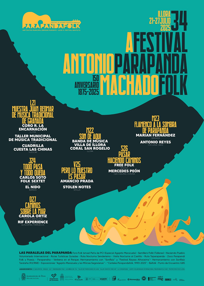 Desde aquí, invito a todos los lectores y lectoras a que se acerquen este verano a Illora y disfruten, del 21 al 26 de julio de 2025, de un Festival Folk que tras superar no pocas dificultades ha conseguido llegar a la edición 34º Festival Parapanda Folk y que este año rinde homenaje al poeta Antonio Machado.