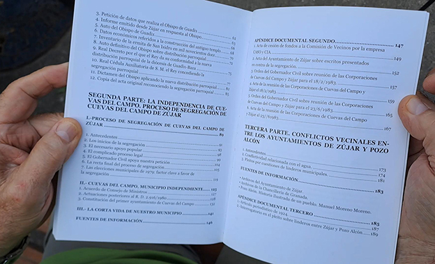 Respecto a la segunda parte del libro señala que está dedicada a la independencia administrativa de Zújar, es decir, a la creación del municipio de Cuevas del Campo, independiente del de Zújar. Al parecer estos deseos de ser independientes se remontan al año 1926, cuando un notario que vivía en en Baza, el señor Iturriaga, presentó un escrito con 300 y pico firmas de cueveños donde se pretendía la creación de Cuevas del Campo como una entidad local menor. El Ayuntamiento de Zújar se opone y entonces surge una resolución judicial curiosa. No se deniega porque no se ajusta derecho, ni porque fuera ilegal. La explicación que se da es que como solamente esa sentencia la recurren dos personas de Cuevas del Campo, don Francisco Rodríguez y don Manuel Martínez, se considera que los demás habitantes de Cuevas del Campo no les interesa la separación. En la segunda república, de hecho, Cuevas funciona como entidad local menor independiente, cosa que se suprime con la victoria de la dictadura.
