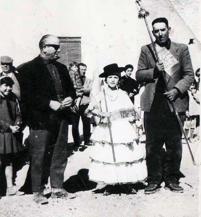 Y he aquí también un contraste que, variable de los tiempos es: no se puede comparar la bata blanca que podrían llevar los “cagarraches” de ahora con el “mono” – ni se sabía de qué color – que llevaban antes; algo hubiera ganado si se le ocurría dar un estrujón al mentado trapo, porque, seguro conseguía escurrir un frasco de aceite, en él almacenado. Venía el sonido, de abajo, de la carretera, de la puerta de “La posá” parecía proceder; las dos vecinas que, muy hacendosas, barrían y asea- Joseillo, Mari Dori y Manuel el del Cortijo Río recibiendo a la Cofradía de Colomera. Foto cortesía de Mari Luz Romero García.