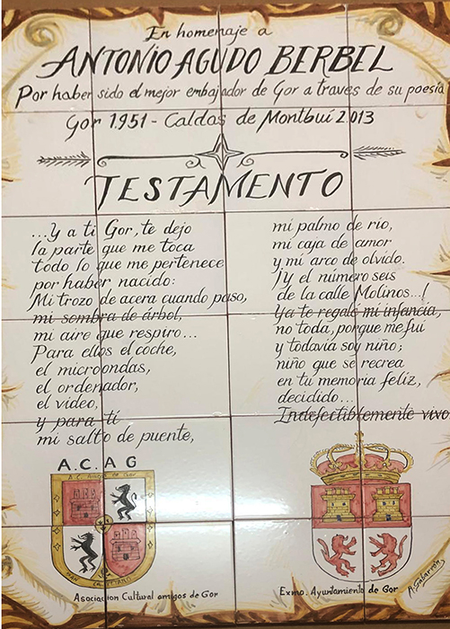 Respeto al merecido homenaje poeta precisa que va a consistir en colocación de una placa en la que se le nombra como el mejor embajador de Gor a través de la poesía donde se podrá leer una de sus composiciones. A continuación en la Plaza Mayor de Gor se celebrará una velada literaria donde se van a recitar poemas de Antonio Agudo y habrá también acompañamiento musical. A este acto están invitadas todas las personas, goreños y no goreños que quieran sumarse a este homenaje a este a este poeta, nacido en Gor en 1951, pero que, después de una infancia dura, tuvo que emigrar a Cataluña y allí es donde él descubre su capacidad literaria y comienza a escribir poesía. Poesía en la que muchas veces habla de lo cotidiano y otras de vivencias profundas. « Es un poeta preocupado y comprometido con la justicia social y así lo manifiesta en en algunos de sus poemas que falleció en el 2013». Desde esta tarde la placa con su poema testamento le recordará en la calle Molino, en una en una pequeña placeta próxima a un árbol grande y un banco.