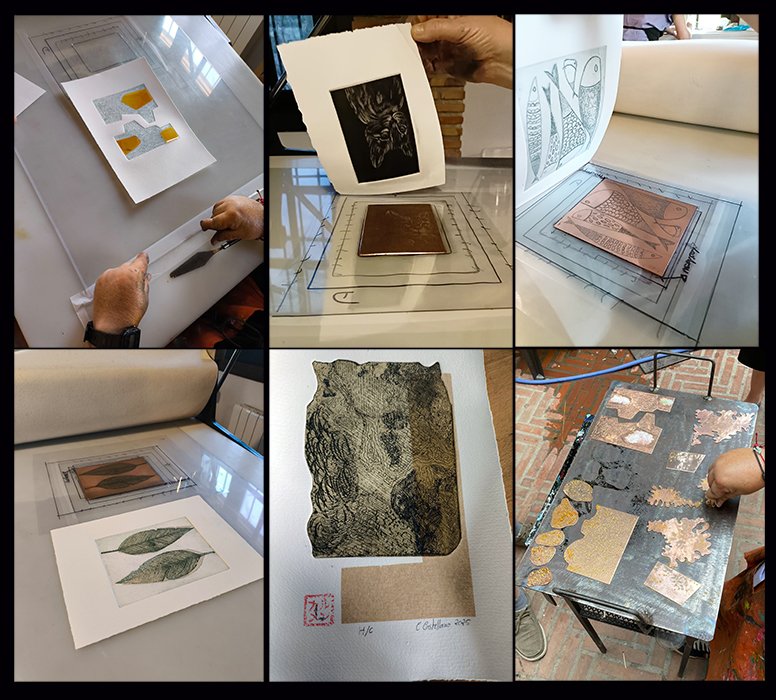 Igualmente comenta que con Emilio Luis han trabajado con planchas de cobre, que también hemos recortado para dar formas diferentes a los grabados, y además, hemos tallado cada uno un sello en piedra.
