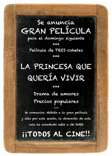 En la puerta del cine expuesta y, en el quicio de su entrada, con aquellas letras blancas pintadas a pincel (aún recuerdo sus trazos ya que muchas veces me gustó leer) la pizarra negra anunciaba la película de la semana, que se proyectaría el domingo en aquel cine que había, frente a las Casas Nuevas de la calle principal del pueblo, calle Madrid. Construido por el muy conocido Sr. Pepe García y don Rogelio Afán de Rivera.