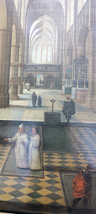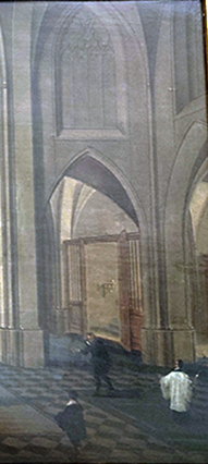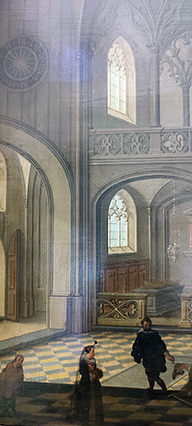 Sin embargo, atrajo poderosamente mi atención: la tabla —al óleo— es, de un lado a otro, el interior de una gran catedral. Es decir, una arquitectura pintada. Están trazados a la perfección sus pilares y arcos apuntados y carpaneles, los abundantes y altos ventanales y las bóvedas de crucería. Se podría estudiar la arquitectura gótica contemplándola. Porque es gótica “brabantina”, según corresponde a la región de Brabante, donde se encuentra Amberes.