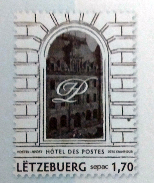 El sello tiene un facial de 1,70€, fue concebido por Reza Kianpulr y se imprimió en alta definición en cuatricomía por la imprenta del correo belga en Malinas. Impresión en hojita minipliego de diez efectos y una tirada total de 30.000 ejemplares que comenzaron a circular el 19 de septiembre del 2025, ahora lucen la imagen de la puerta principal de ese edificio ubicado en el casco histórico de la capital ducal, con sus 8.600 metros cuadrados se ha convertido, gracias al grupo francés ARTEA, en un centro hotelero en el 75% de su superficie. El resto, al margen de las correspondientes servidumbres del negocio [bares, restaurantes, recepción, etc.] serán destinados a oficinas o negocios de trabajo compartido que, con las modernas tecnologías, proliferan como hongos y se aposentaron para colonizar el espacio del edificio postal, el rediseño interior lo realizó Geraldine Dohogne.