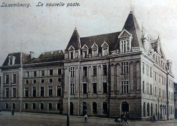 El edificio originalmente -o los terrenos- fue la sede de la guarnición prusiana, el correo se instaló en este predio en 1869 y casi siglo y medio fue la sede del servicio postal ducal que acabaría levantando el actual entre 1908-1910 en esta zona que antaño ocuparon los militares prusianos, el arquitecto de este bello y funcional ejemplo de arquitectura administrativa fue Sosthène Weis y ese trabajo acabaría convirtiéndose en símbolo de la pequeña capital luxemburguesa hasta el 2017.