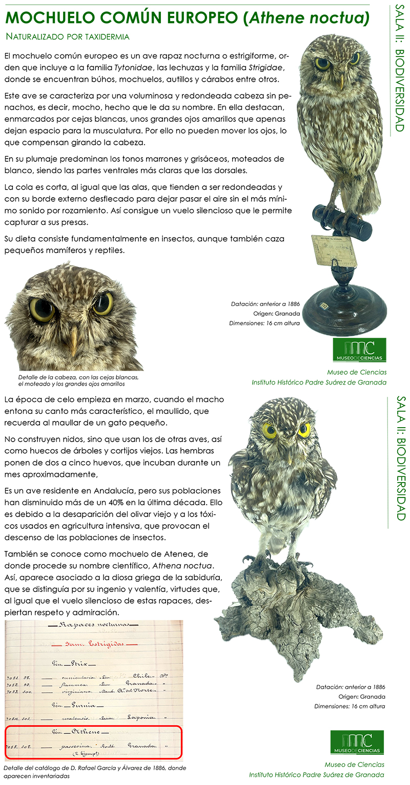 Comienza un nuevo curso escolar, cargado de ilusiones y proyectos. Y la responsable del Museo de Ciencias, Mª Adelaida Adarve, vuelve a compartir el increíble patrimonio del Museo de Ciencias, esta vez con un ave, el mochuelo común, también llamado mochuelo de Atenea, diosa de la sabiduría y la inteligencia, a quien esta ave siempre acompañaba.