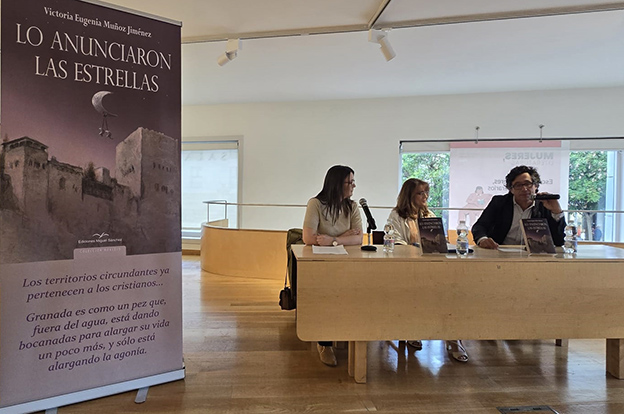 La profesora y escritora, Victoria Eugenia Muñoz Jiménez, vuelve a la actualidad literaria con su nueva novela histórica, ‘Lo anunciaron las estrellas’ (Ediciones Miguel Sánchez) con la que da continuidad a ‘Huyendo a Granada’ que tuvo dos ediciones en 2017 (Esdrújula ed.) y 2021 (Ed. Nazarí). Esta licenciada en Filosofía y Letras por la UGR, debutó con ‘El corazón del roble’ (Ed. Nazarí, 2014) y cuenta además con otros títulos dirigidos a un público infantil, como es el caso de ‘Fantasmas, bichos y manzanas, Paulinas, 2022) y también juvenil como ‘Carambola de cristal’ (Ed. Miguel Sánchez, 2023). Con ‘Lo anunciaron las estrellas’ regresa a un espacio y tiempo muy del agrando de sus lectores como es el ocaso del Reino de Granada. En ella personajes históricos y ficticios se dan la mano para dar verosimilitud a la historia a la par que le sirve de excusa para ofrecer talleres y rutas literarias a las que ahora ha añadido la posibilidad de acercarse a la historia a través del gusto al ofrecer recetas tomadas de Internet de platos típicos.