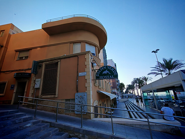 Uno de estos lugares tradicionales es el Hostal Delfín Verde (que todavía sigue abierto) en pleno Paseo Marítimo, en uno de cuyos apartamentos frente al mar el músico se alojó durante las primeras semanas de su estancia en Almería.