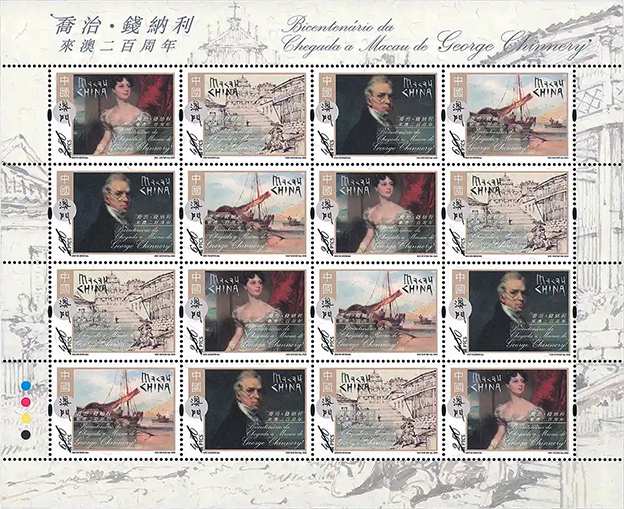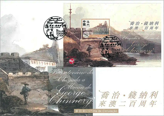 El personaje que hoy es honrado en las estampillas de la ex-colonia lusa, fue un pintor inglés [Londres 05.01.1774-Macao 30.05.1852] que se pasó la mayor parte de su vida en la India y el sur de China. Disfrutó de una vida que, en la distancia, podríamos decir fue de novela hasta que recaló en Macao en 1825, una época en que los occidentales tenían restringido el acceso a China y muchos acababan instalándose en las entonces colonias de Hong Kong y la propia Macao. Allí se convirtió en un conocido y cotizado retratista que mostró mucho interés por los lugareños y ello le valió destacar en un mercado no excesivamente interesado por la pintura occidental. Hoy su legado pictórico alcanzó un gran prestigio y está diseminado por innumerables museos y galerías de arte en diferentes lugares del mundo.
