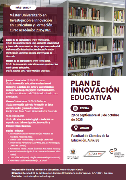 Por segundo año consecutivo tuve el honor de representar al CEIP Federico García Lorca de Olivares en el Máster Universitario en Investigación e Innovación en Currículum y Formación de la Facultad de Ciencias de la Educación de la Universidad de Granada, correspondiente al curso 2025/2026. La ponencia se celebró el pasado 2 de octubre, en horario de tarde, ante una treintena de estudiantes de Magisterio, Pedagogía, Psicopedagogía y futuros docentes.
