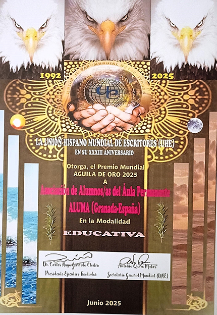 Como cada martes, después de clase, ALUMA celebró su Tertulia Poético-Literaria, que con tanto acierto dirige Luis de la Rosa, ese espacio donde la palabra florece y la emoción se hace voz. Sin embargo, la de hoy fue una tarde distinta, revestida de un brillo especial. En el comienzo del acto, Rafael Hernández, en nombre de la Unión Hispano Mundial de Escritores (UHE), entregó a ALUMA el Premio Mundial Águila de Oro 2025, en la modalidad Educativa.
