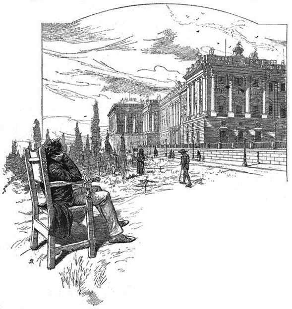 Sale a la calle y ve cómo la gente se dirige al cementerio y entonces “comencé a ver claro. El cementerio está dentro de Madrid. Madrid es el cementerio” y “ comencé a pasear con toda la devoción y recogimiento de que soy capaz las calles del grande osario” y en este paseo identifica diferentes edificios institucionales con sepulcros a los que les pone breves y terribles epitafios: “El Palacio Real. Aquí yace el Trono”; “La Bolsa. Aquí yace el crédito español”; “ Los Ministerios. Aquí yace media España; murió de la otra media”; “La Imprenta Nacional, este es el sepulcro de la verdad”; “Los teatros. Aquí reposan los ingenios españoles”. Y así va sucesivamente describiendo hasta que anota “ Pero ya anochecía, y también era hora de retiro para mí. Tendí una última ojeada sobre el vasto cementerio. Olía a muerte próxima”.