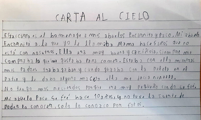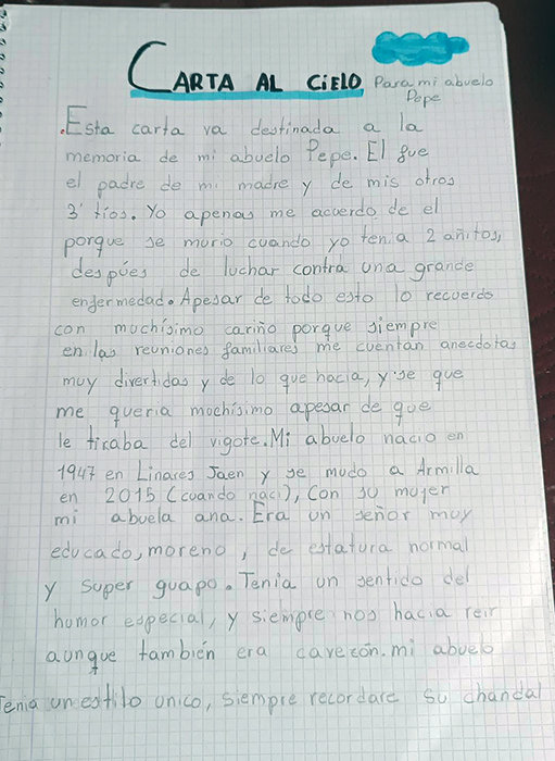 La «carta al cielo», fue en primer lugar una sacudida en mis recuerdos… Tenía que ponerlos en orden para poder ayudar a mi hija a hacer un emotivo homenaje pero sin caer en el drama, más bien con tintes simpáticos que es como creo que se deben de recordar a nuestros seres queridos que ya no están.