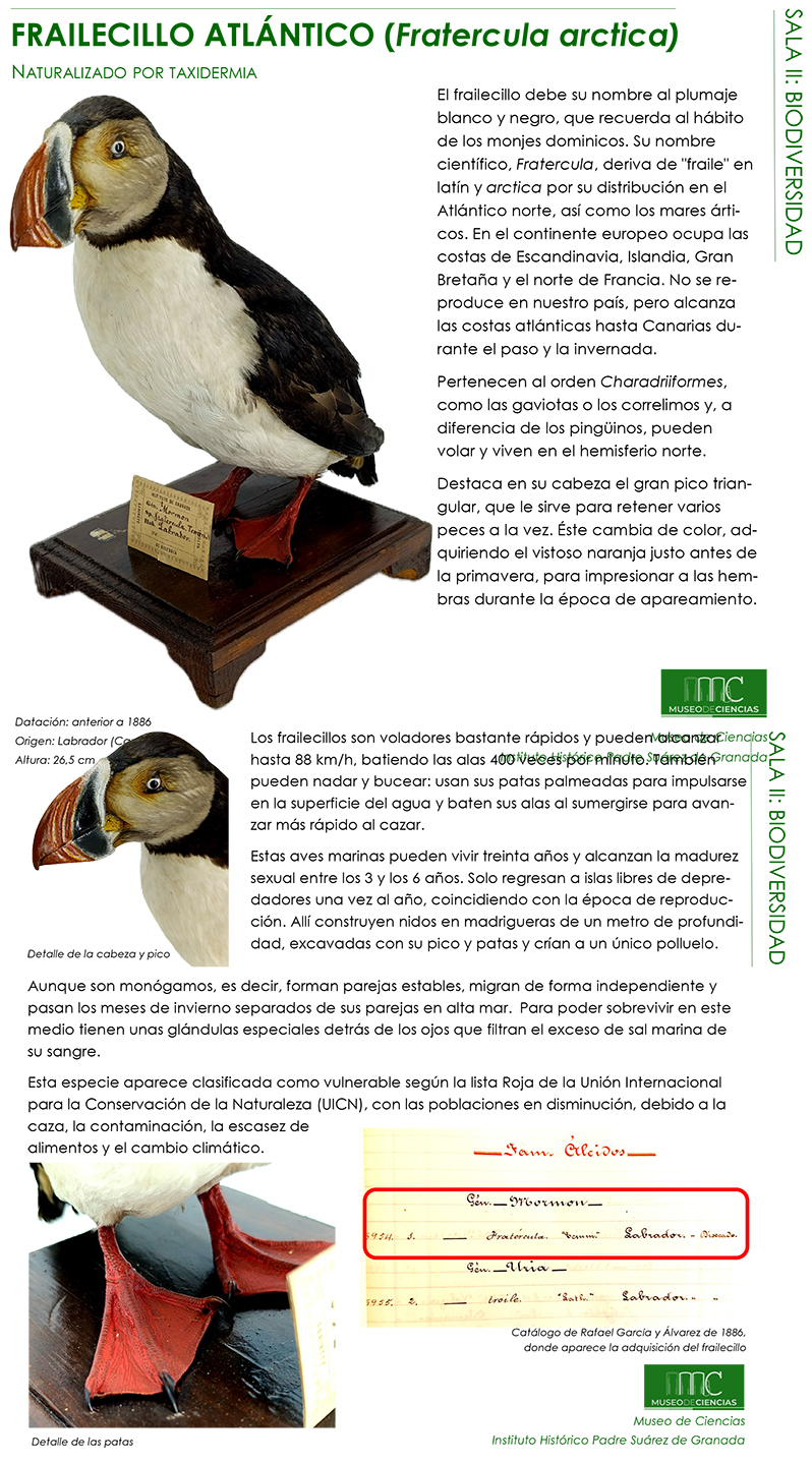 El frailecillo atlántico llama la atención por su plumaje blanco y negro y su llamativo pico triangular en la época de cría. Adelaida Adarve, responsable del Museo de Ciencias del Instituto Histórico, nos presenta esta semana un ejemplar de esta ave marina, que se enfrenta a numerosas amenazas.