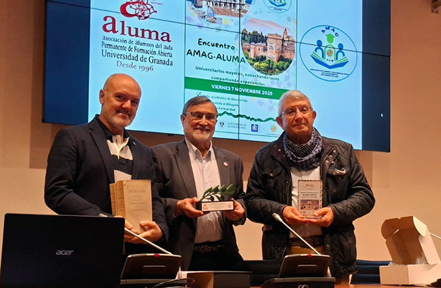 La jornada comenzó en la luminosa Sala Triunfo, donde se celebró el acto de bienvenida, presidido por Juan Antonio Maldonado, director del Aula Permanente de Formación Abierta (APFA); Juan Manuel Arévalo, presidente de AMAG; y José Rodríguez, presidente de ALUMA.