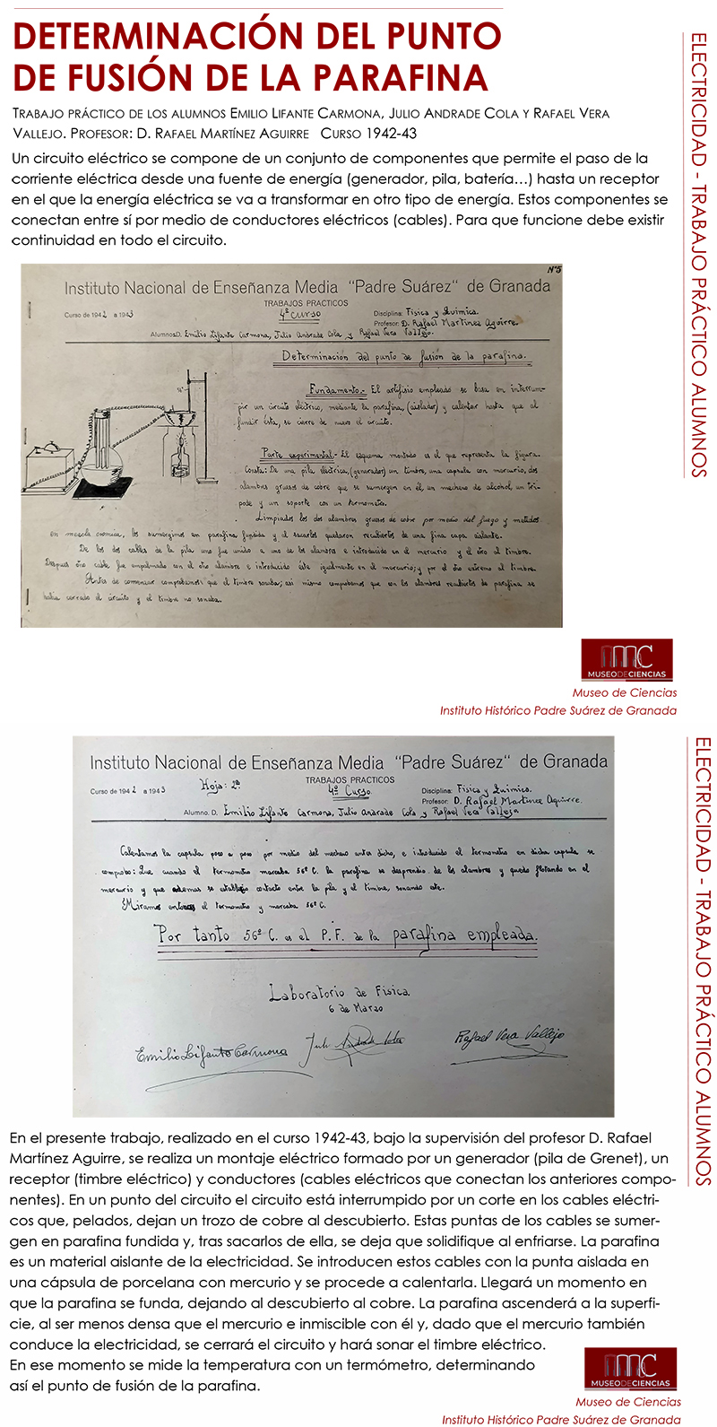 No solo artefactos se exponen en la sala de Física y Química del Museo de Ciencias del Instituto Histórico Padre Suárez de Granada. Su responsable, José Emilio Padilla, nos muestra este miércoles un trabajo práctico, realizado por alumnos del profesor D. Rafael Martínez Aguirre en el curso 1942-43, para determinar el punto de fusión de la parafina de forma muy original.