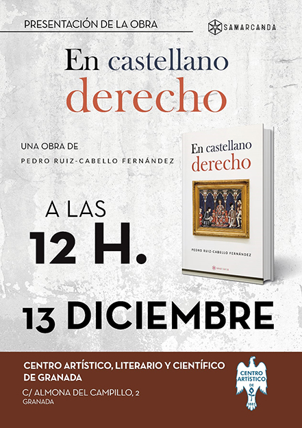 El sábado, 13 de diciembre, a las 12 horas, se presentará en el Centro Artístico, Literario y Científico de Granada la novela En castellano derecho, de Pedro Ruiz-Cabello Fernández. Publicada en 2015 por la editorial Verbum, se ha reeditado en Samarcanda después de haberse revisado y corregido. Se trata de una novela histórica sobre Alfonso X el Sabio. Entre otras cosas, lo que ha movido al autor a sacarla de nuevo ha sido el interés que suscitan la figura y la obra del monarca castellano, posiblemente el más desgraciado de la historia de España, a juicio de Manuel González Jiménez, su mejor biógrafo.