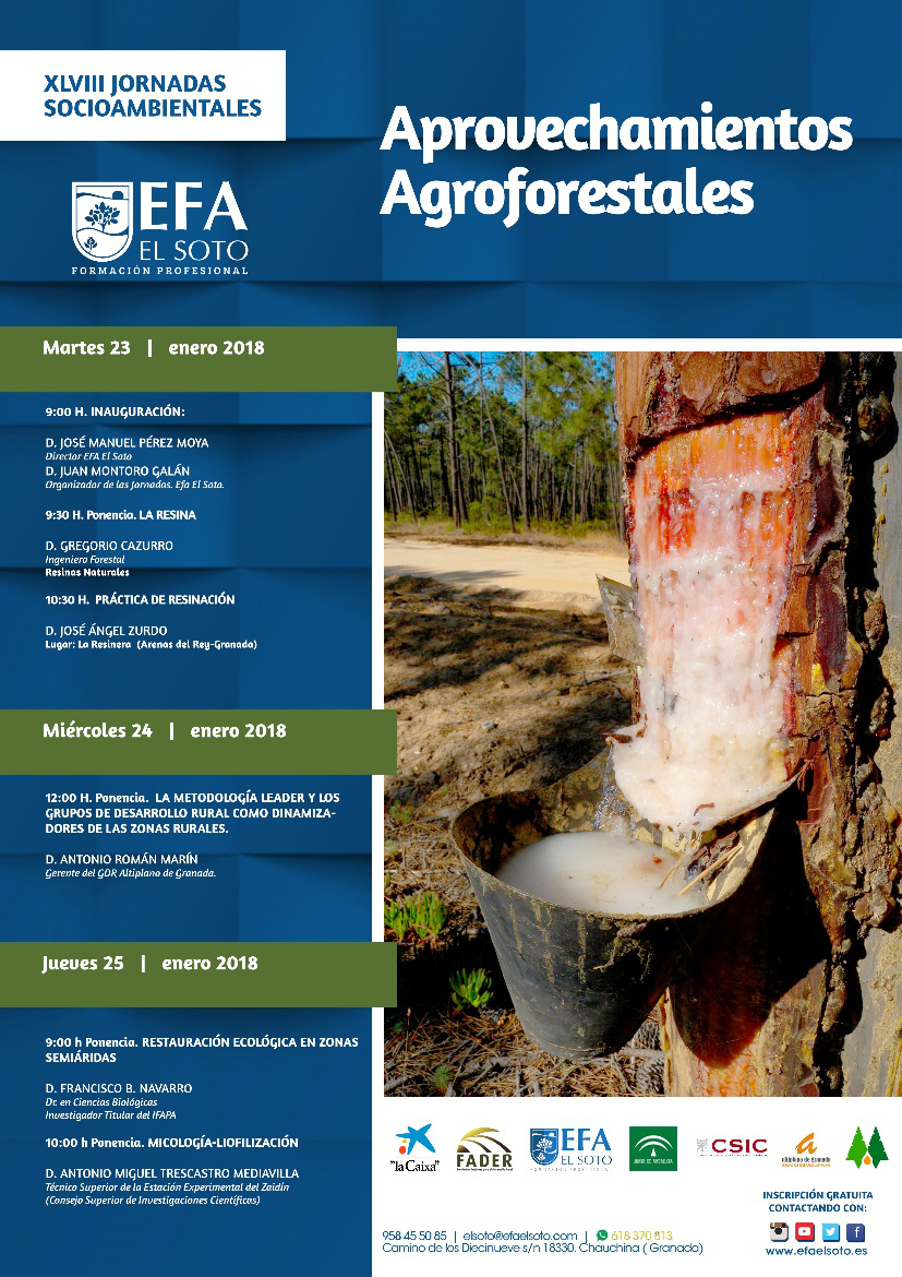 Entre los días 23 y 26 de enero se han celebrado en el Centro de Formación Profesional EFA “El Soto” las XLVIII Jornadas Socioambientales, dedicadas en esta ocasión a los Aprovechamientos Agroforestales, con una asistencia masiva, coordinadas por Juan Montoro galán, profesor de esta escuela en la especialidad de las Jornadas.
