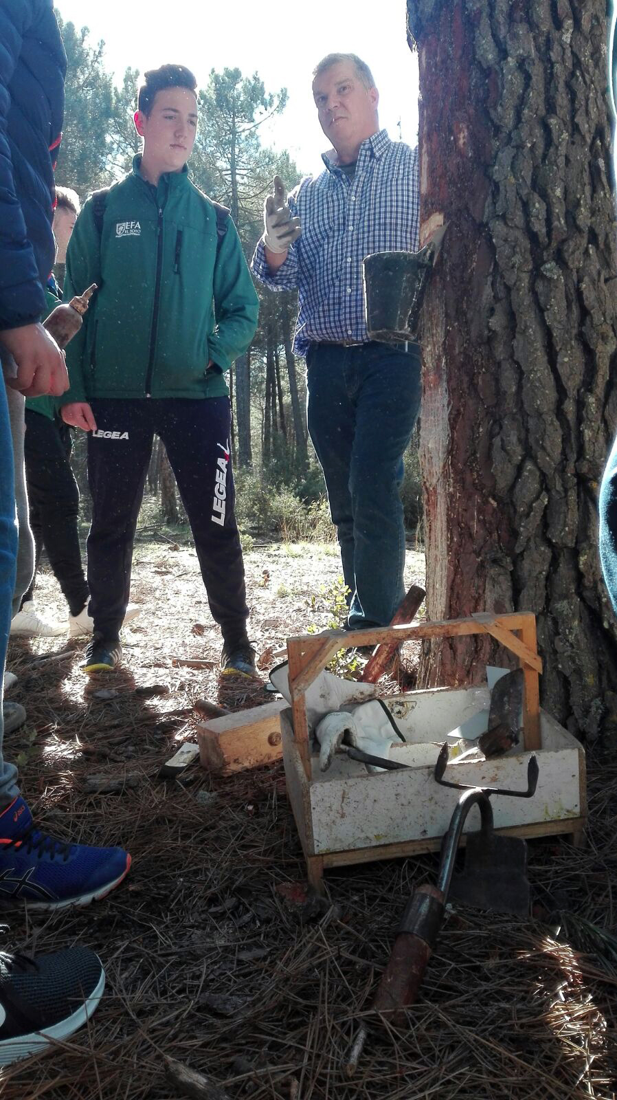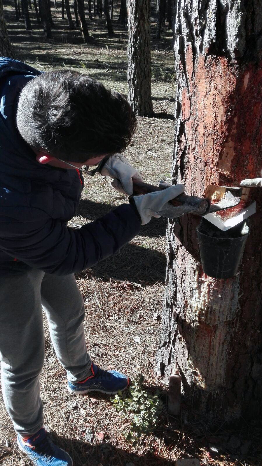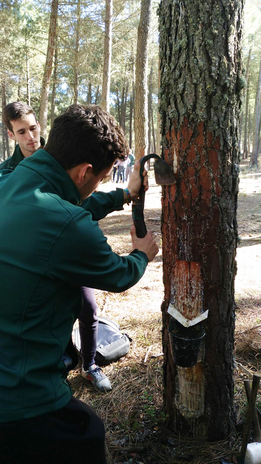 El día 23, Gregorio Cazurro, Ingeniero Forestal de la Empresa Resinas Naturales, desarrolla la primera ponencia sobre La Resinación, destacando la evolución histórica de la resinación en la Península Ibérica y la incidencia internacional en la misma. Por otro lado, profundizó en las técnicas utilizadas en el proceso de extracción y las utilidades de la materia prima obtenida. Después de la Ponencia nos dirigimos al Parque natural de la Sierra de Tejeda, Alhama y Almijara, al paraje conocido como El Robledal, donde el técnico José Ángel Zurdo de la empresa Resinas Naturales nos inició de una forma magistral en la práctica de la resinación. Los asistentes pudieron utilizar las herramientas y resinar una buena cantidad de pinos.