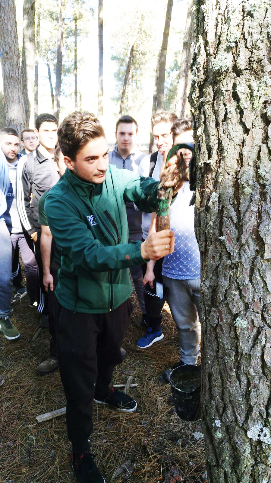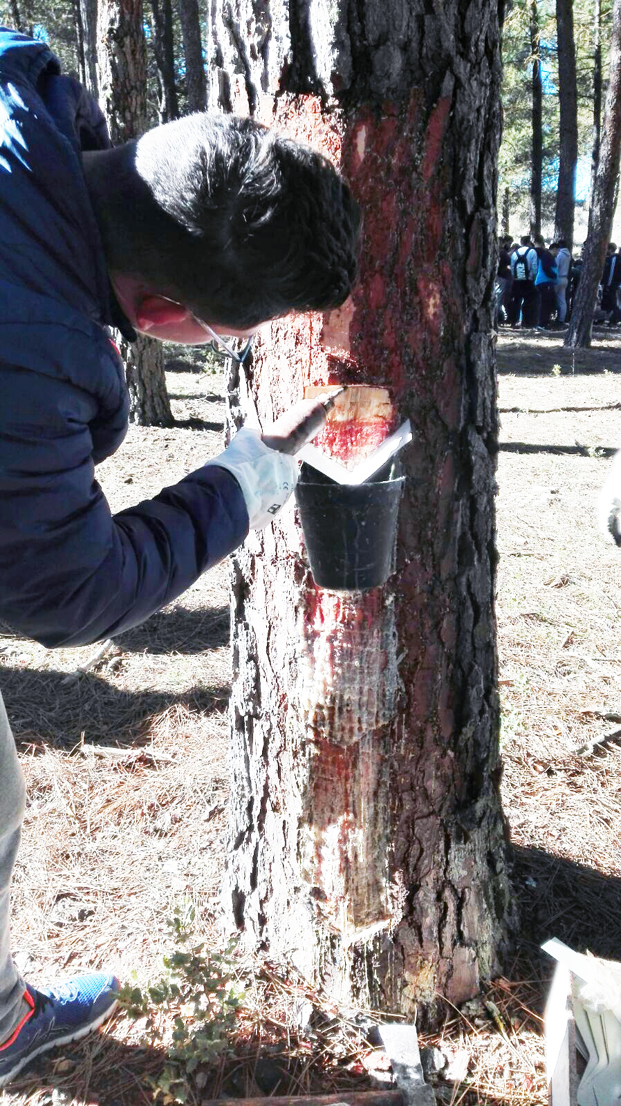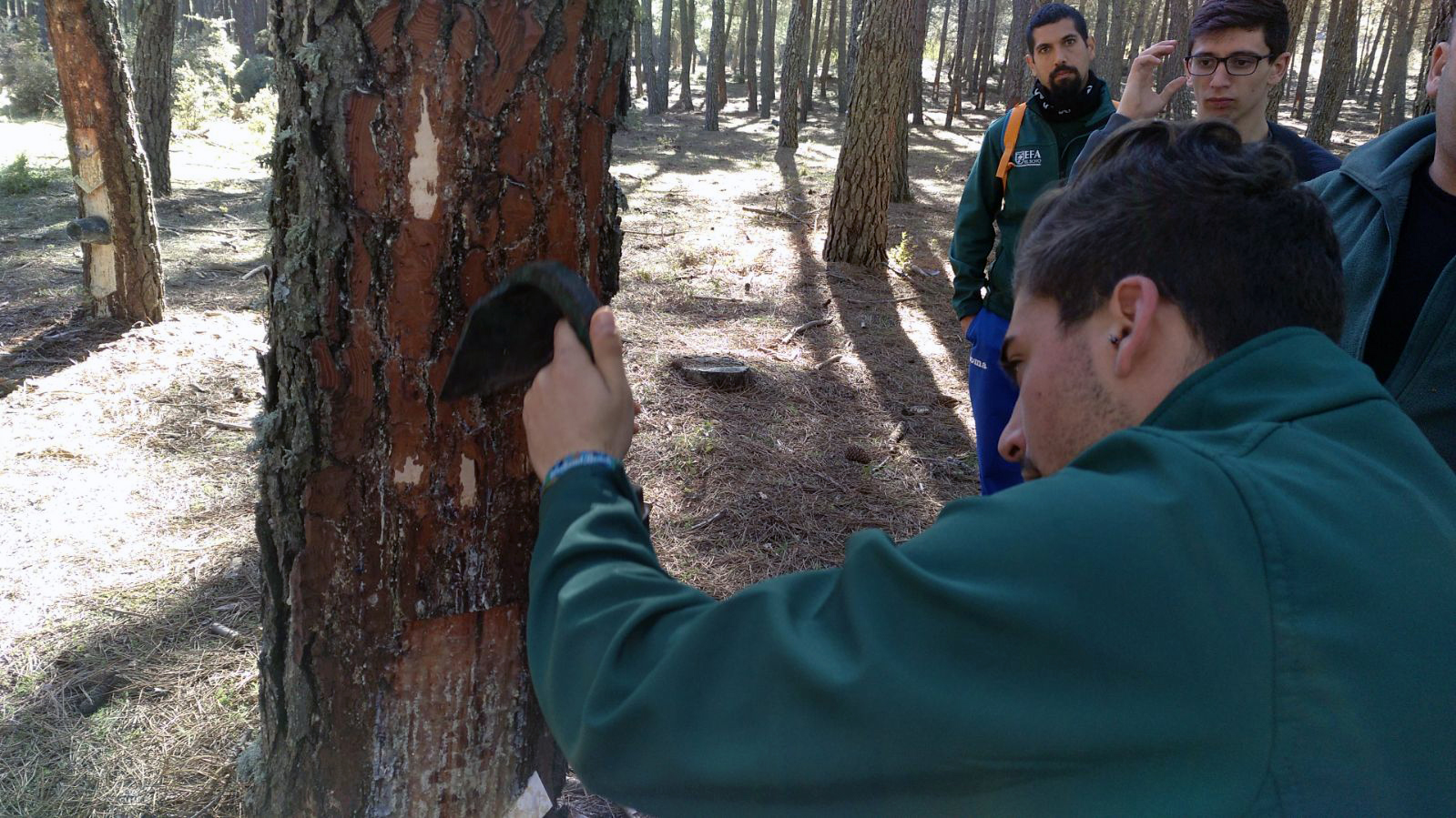 El día 23, Gregorio Cazurro, Ingeniero Forestal de la Empresa Resinas Naturales, desarrolla la primera ponencia sobre La Resinación, destacando la evolución histórica de la resinación en la Península Ibérica y la incidencia internacional en la misma. Por otro lado, profundizó en las técnicas utilizadas en el proceso de extracción y las utilidades de la materia prima obtenida. Después de la Ponencia nos dirigimos al Parque natural de la Sierra de Tejeda, Alhama y Almijara, al paraje conocido como El Robledal, donde el técnico José Ángel Zurdo de la empresa Resinas Naturales nos inició de una forma magistral en la práctica de la resinación. Los asistentes pudieron utilizar las herramientas y resinar una buena cantidad de pinos.