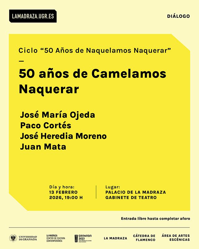 Con motivo del 50 aniversario del estreno de Camelamos Naquerar, el viernes, 13 de febrero de 2026, se organiza un encuentro conmemorativo que rinde homenaje a una de las obras más trascendentales de la cultura gitana y el arte flamenco. Será en el Gabinete de Teatro del Palacio de la Madraza, a partir de las 19 h.