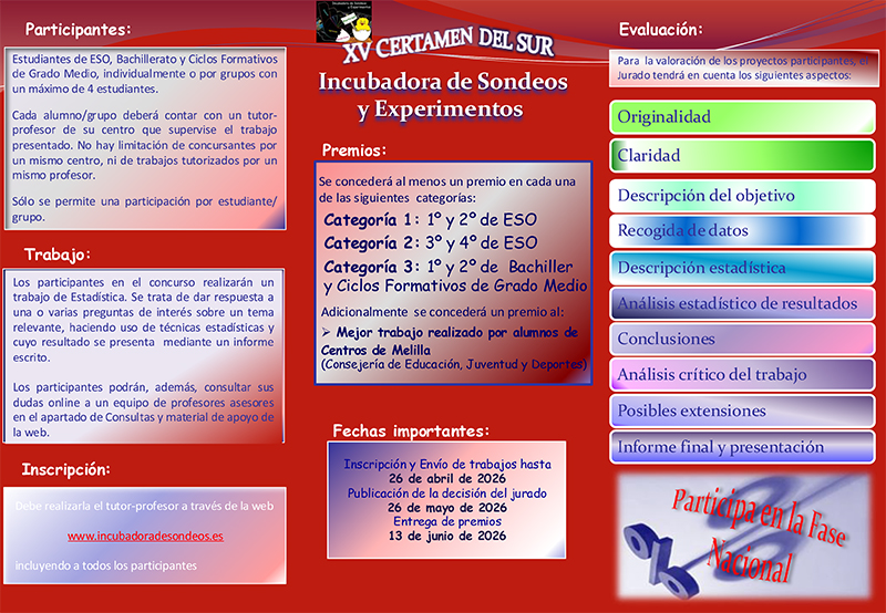 A este certamen se pueden presentar trabajos de Estadística realizados por grupos de estudiantes de ESO, Bachillerato y Ciclos Formativos de Grado Medio. La inscripción y presentación de trabajos finaliza el 26 de abril de 2026.