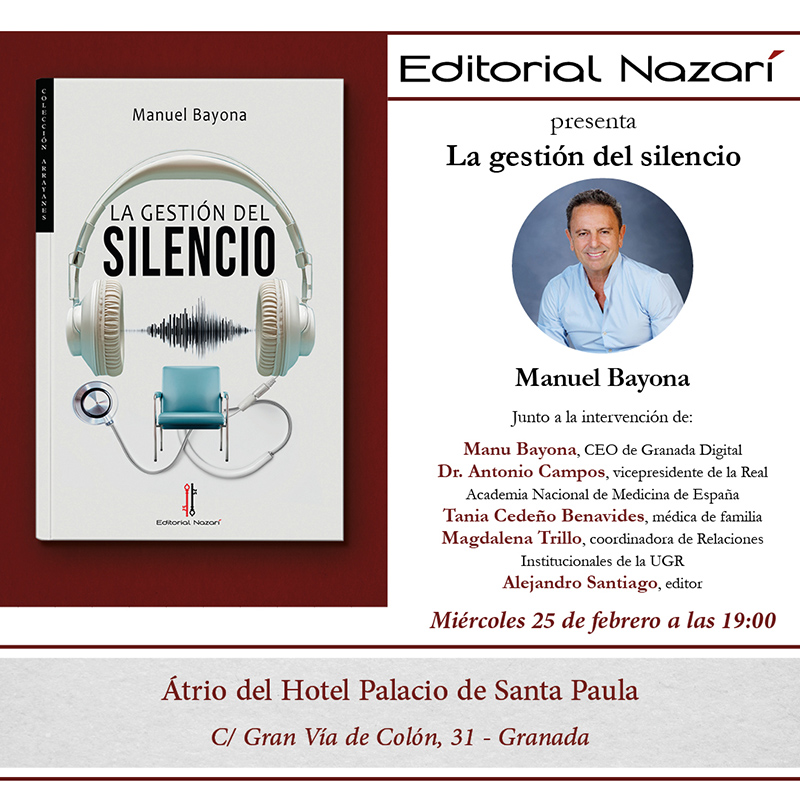 El evento contará con la intervención del autor junto a destacados profesionales: Manu Bayona, CEO de Granada Digital; Dr. Antonio Campos, vicepresidente de la Real Academia Nacional de Medicina de España; Tania Cedeño Benavides, médica de familia; Magdalena Trillo, coordinadora de Relaciones Institucionales de la UGR; y Alejandro Santiago, editor. Todos los interesados en literatura, salud y gestión emocional están invitados a asistir; reserva tu plaza contactando con Editorial Nazarí
