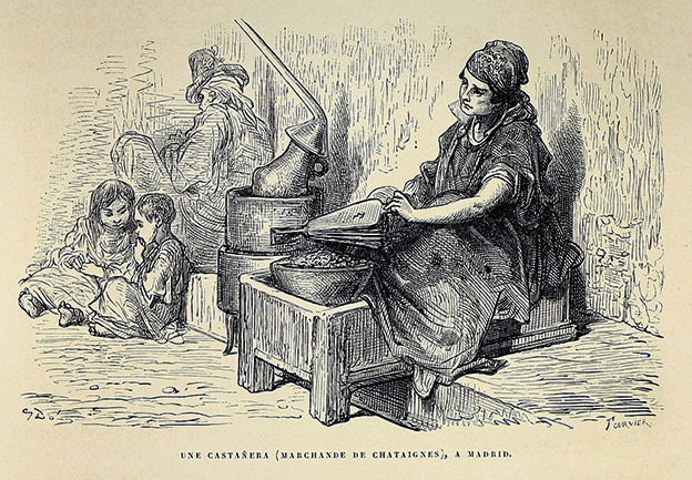 Ocupación que empezó en el último tercio del siglo XVIII cuando las calles de Madrid se poblaron de mujeres que en los meses más fríos ofrecían castañas cocidas o asadas a los transeúntes. Las castañas eran un alimento humilde pero barato, calórico y saciante. Muy apropiado para la clase trabajadora, llenaban el estómago, calentaban las manos y daban energía, en muchas ocasiones eran la única comida que hacían.