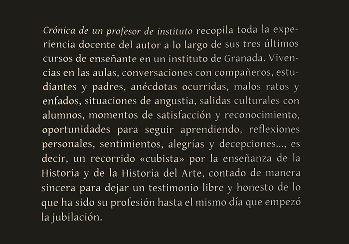 Aclara igualmente que «trata de ser toda una visión y una reflexión sobre la enseñanza hoy día a lo largo de 3 últimos años en este instituto Padre Manjón, que me ha dado tanto placer y tanto orgullo, pero con constantes recuerdos de lo que ha sido también la enseñanza en mis años anteriores en Salobreña, en Andújar o en La Línea». Por último explica que el libro consta básicamente de tres capítulos y un epílogo. Cada uno de los capítulos corresponde a uno de los cursos en los que ha centrado su experiencia y el epílogo final trata de ser una conclusión de su vida docente.
