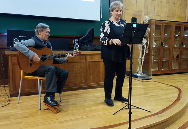 La dimensión musical elevó aún más la intensidad de la tarde. El maestro José Manuel Cano acompañó a la guitarra a Luis de la Rosa, quien recitó tanto poemas propios como versos del universal Manuel Benítez Carrasco, estableciendo un emotivo diálogo entre la tradición poética granadina y la creación contemporánea. La combinación de palabra y música creó un ambiente íntimo y evocador que envolvió a los asistentes.