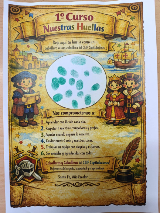Fue precisamente a raíz de esa representación cuando cada clase vivió su propio momento histórico. De vuelta al aula, alumnos y tutores elaboraron juntos sus propias capitulaciones. No las de 1492, claro, sino las de este curso: un contrato colectivo de buen comportamiento y compromiso con el trabajo bien hecho, redactado entre todos y firmado uno a uno. La actividad funcionó como un espejo de lo que acababan de ver: si Colón negoció unas condiciones para su empresa, ellos también podían pactar las suyas. La conexión entre la efemérides y el presente quedó tendida de forma natural, sin que nadie tuviese que explicarla demasiado.