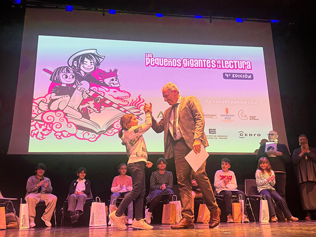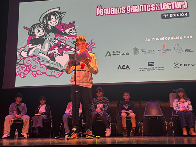 ‘Los pequeños gigantes de la lectura’, coordinado por la empresa de innovación cultural PALIMPSESTO, es un proyecto de educación artística y cultural que tiene como objetivos promover la lectura en clave lúdica y la bibliodiversidad, y estrechar 3 vínculos entre los colegios y el sector del libro. El escritor de literatura infantil y juvenil Santiago García-Clairac apadrina esta 4ª edición. La mecánica del juego es sencilla: los niños y niñas de la clase participante leen en voz alta un texto de su elección durante tres minutos. Los mejores lectores, elegidos por compañeros, compañeras y jurados, conforme van superando las distintas fases, avanzan hasta la final nacional. Los 11 representantes de las 11 Comunidades Autónomas subirán al escenario de la final nacional con los autores de los libros elegidos el 5 de junio en la Feria del Libro de Madrid.