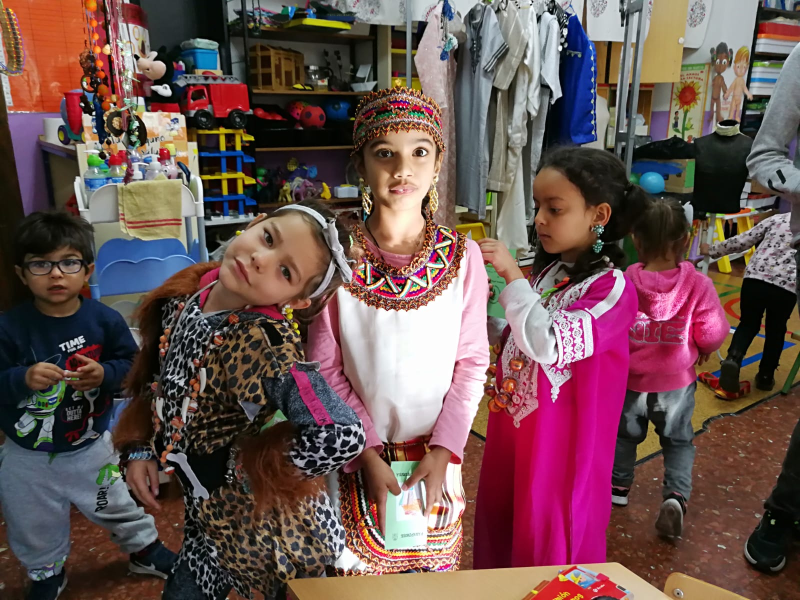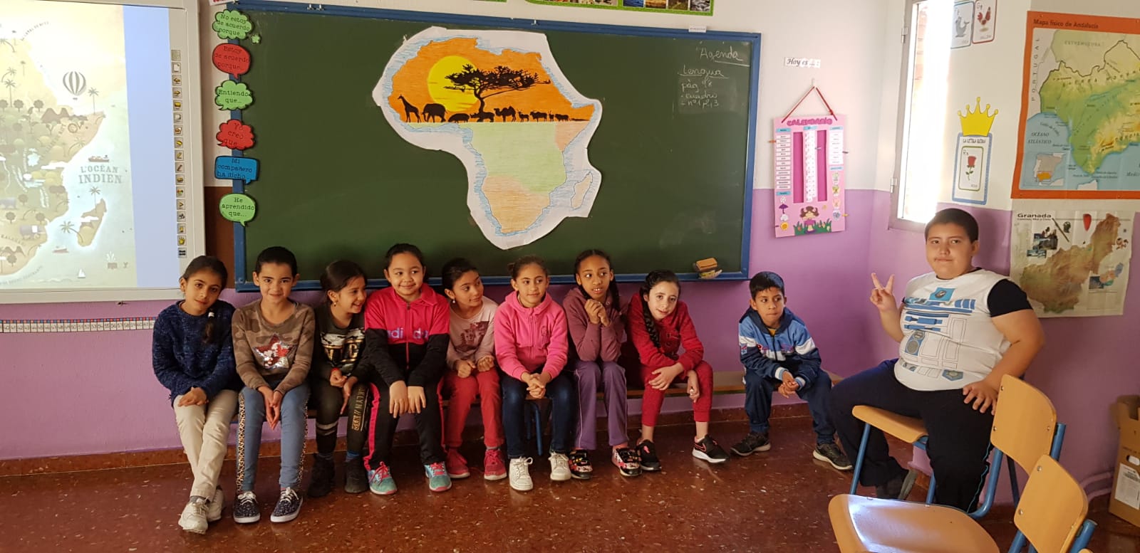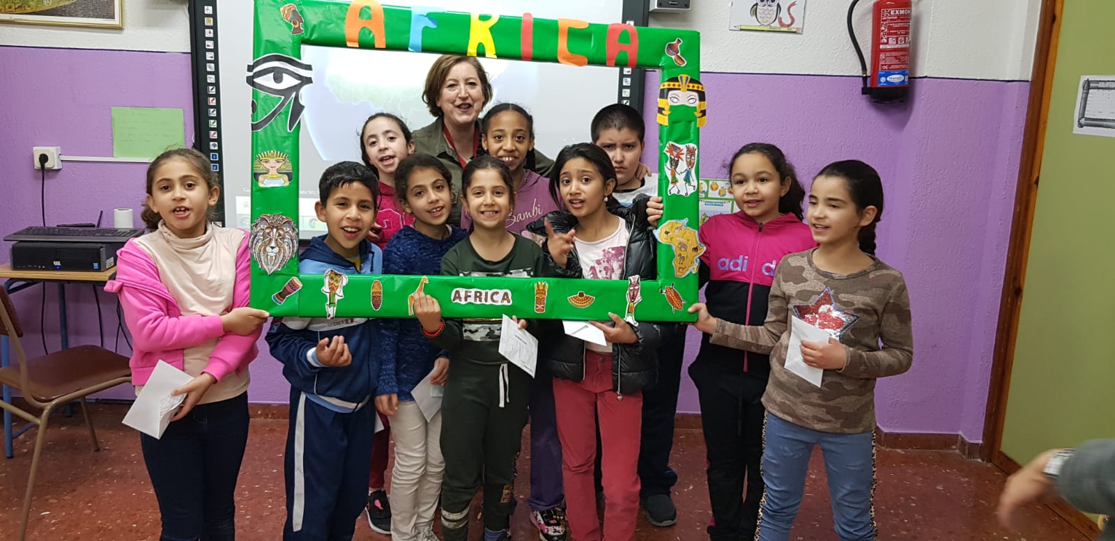 Videoviaje por África. Han recorrido el continente mediante una exposición de todo tipos de objetos aportados por la comunidad educativa y diferentes asociaciones y realizado un viaje virtual desde nuestro centro a diferentes lugares del continente. Para terminar han tenido la posibilidad de llevarse un bonito recuerdo en el Photocall de este taller.